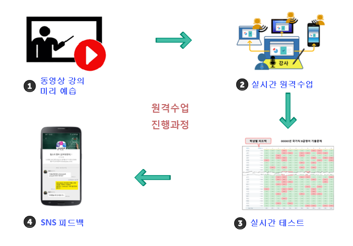 녹화된 동영상 강의를 미리 예습하여 정해진 시간에 스마트폰, 태블릿, 또는 PC 로 접속을 하고 동시에 질문을 주고 받는 쌍방향 수업이 이루어집니다. 오프라인 강의실에서 질문하려면 용기가 필요하지만, 원격수업은 누구의 눈치도 볼 필요가 없기 때문에 적극적인 수업 참여가 이루어집니다.